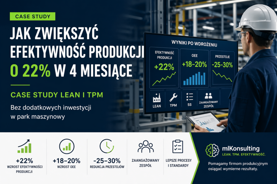Zobacz, jak zwiększyć efektywność produkcji o 22% w 4 miesiące dzięki Lean i TPM. Praktyczne case study z produkcji. Wiele firm produkcyjnych zmaga się z tym samym problemem – niską efektywnością, częstymi przestojami oraz brakiem…
